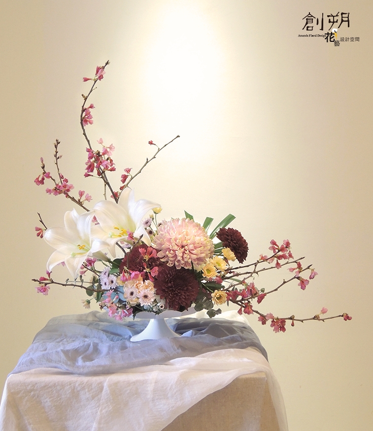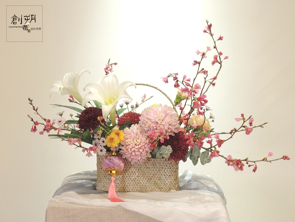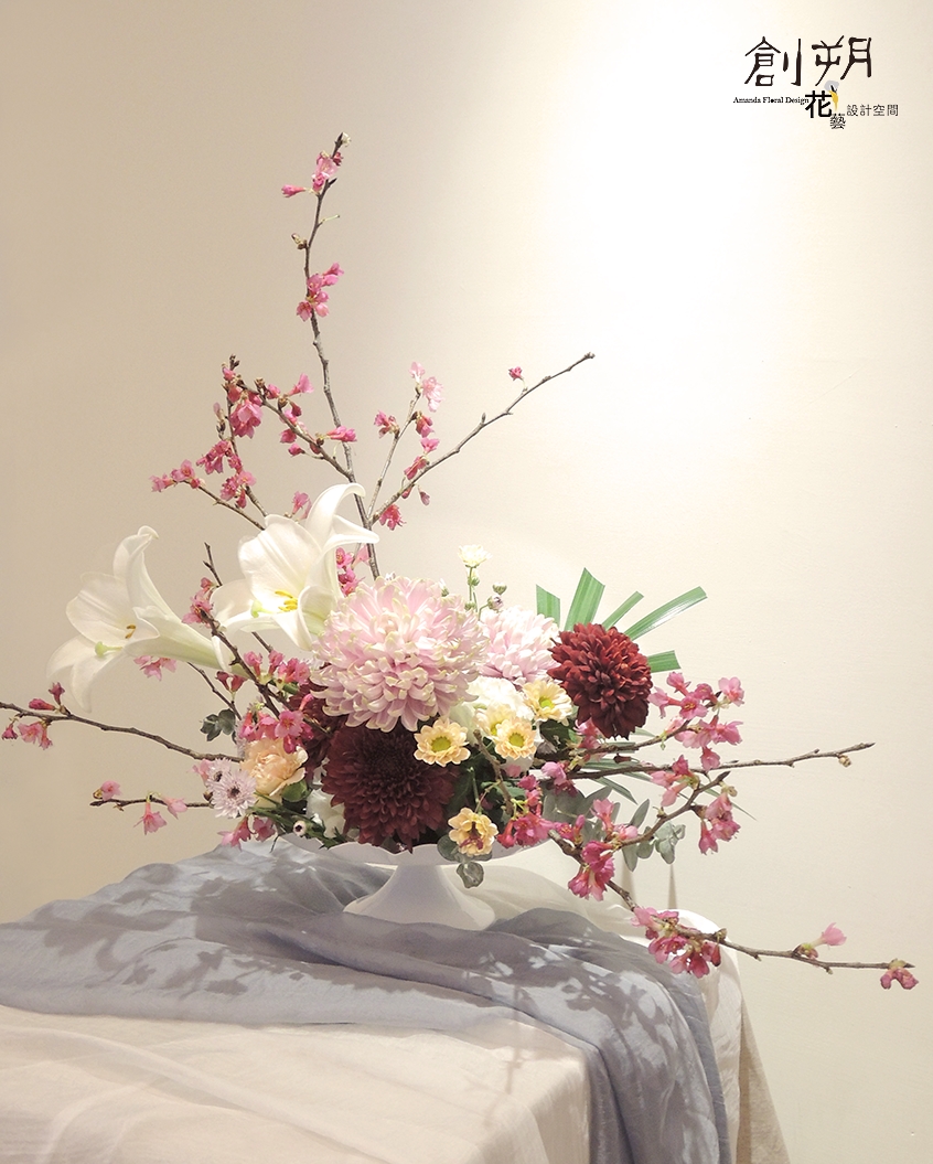 櫻花、進口大粉菊、進口紅菊、白百合(或粉色重瓣百合)、進口粉膚大康乃馨、粉紫小菊、粉膚小菊、棕梠葉、尤加利葉。