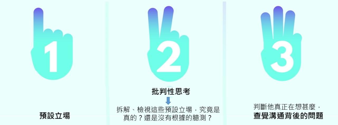 透過批判性思考的練習,我們可以學會找出、拆解、檢視這些預設立場,究竟是真的?還是沒有根據的臆測?我們也可以透過「預設立場 」的練習,加上提問技巧的應用,篩檢、縮小對方背後想法的範圍,判斷他真正在想甚麼,找出問題背後的問題。