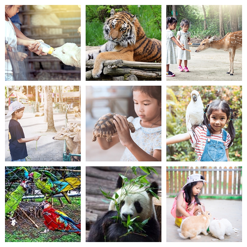 大象,老虎, 狮子,猩猩, 海狮,长颈鹿,熊等,当然还有可爱的熊猫