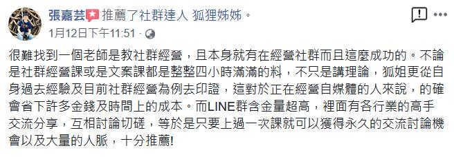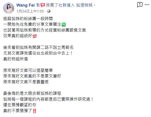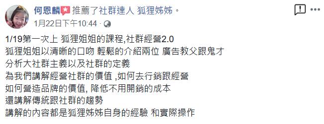 如果不相信,最簡單我可以問你一個,你看過哪一位數位行銷老師,會親自下來在自己粉絲頁,回應每一個網友的提問?我會延續這樣的「優良傳統」,正因為我是道道地地,從第一線的社群小編,轉任職業講師的狐狸姊姊。