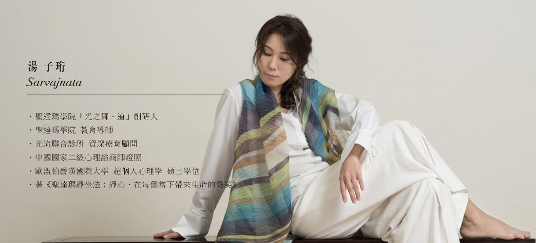 2003年起跟隨聖達瑪學院創辦人-聖塔達瑪老師學習至今,已累積長達17年的性靈淬煉與專研,多次遠赴西藏、印度、尼泊爾等數十國自我修煉,創化出從身入心的獨特修煉方式「光之舞.道」,以身體、舞蹈來體悟生命 及體悟生命背後的道,自此開始教導人們如何透過身體深度覺察與連結,以品嚐生命動能開啟和意識開展後的平衡喜樂狀態。