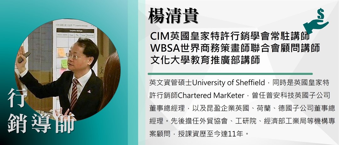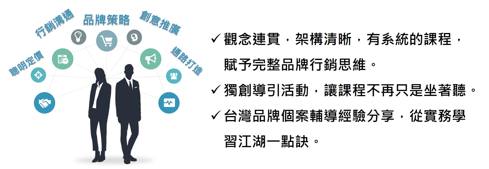 概念將從品牌建立的源頭出發,有系統地帶領學員貫穿品牌策略、行銷溝通、價格設計、通路打造、包裝設計與創意推廣,盡覽行銷的全方位面向;應用的教戰,則會以豐富的業界案例及實務經驗,再藉講師導引的獨特方式,讓學員體驗常輕忽的行銷戰略混淆、訂價陷阱、通路挑戰……等細節中的魔鬼。