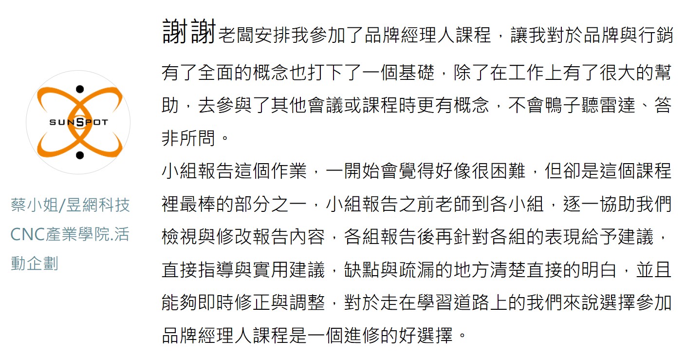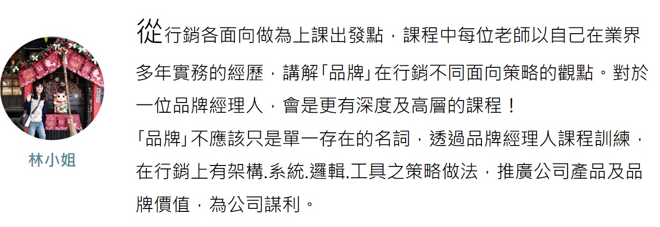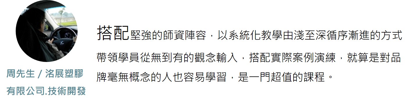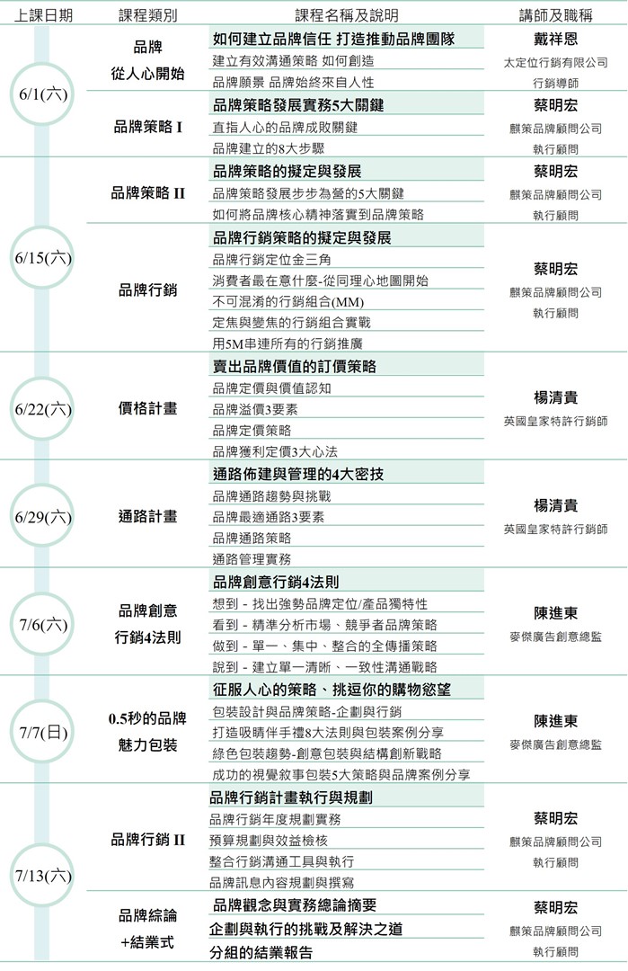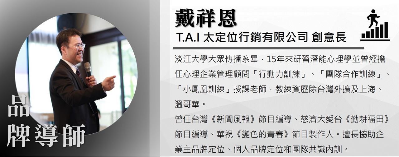 本次【台灣品牌交流協會】主辦的「第三屆 全方位品牌行銷經理人實務培訓班」,特別與在業界計有數十年經驗的四大講師 策略導師 蔡明宏(麒策顧問)、創意導師 陳進東(麥傑廣告)、品牌導師 戴祥恩(太定位行銷)、行銷導師 楊清貴(CIM英國皇家特許行銷師) 聯手授課,42小時課程,從基礎到進階,從策略到產品設計,帶你學會品牌行銷的方方面面!