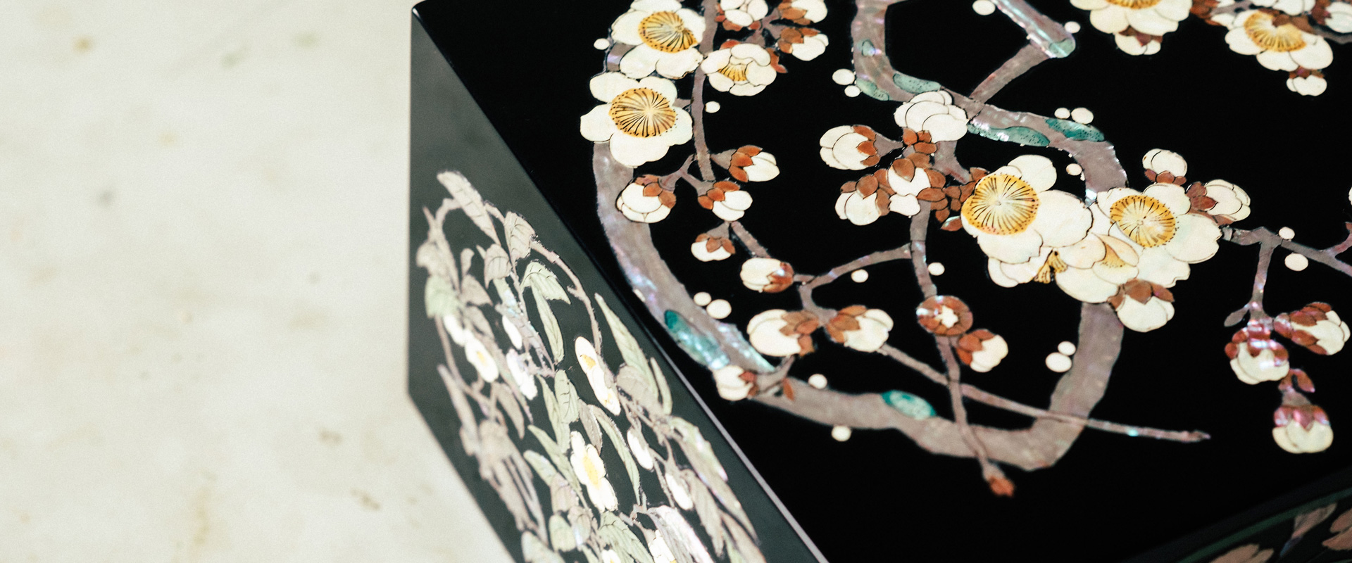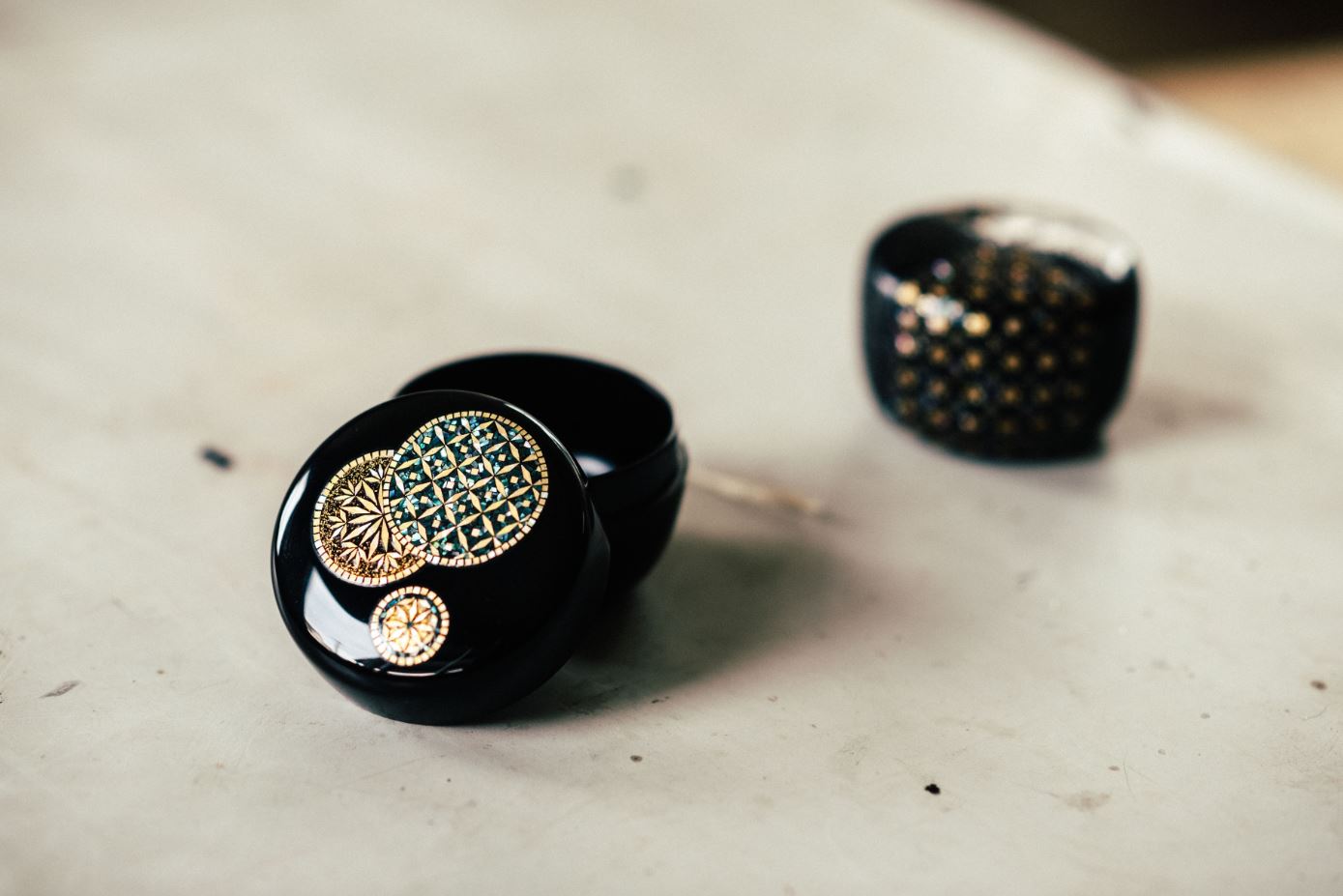 貝殼的色彩斑斕絢麗,帶有珠光,只要一改觀看角度光澤也會隨之改變。富山的螺鈿漆器,汲取歲月與文化的優雅風華,將繁複的雕刻體現於漆器上,花鳥、蔓草、方格菱角、漩渦齒狀等形狀層層堆砌成不同的造型,在物件表面營造出一片華麗,和深色的塗漆相映則更加典雅細緻。