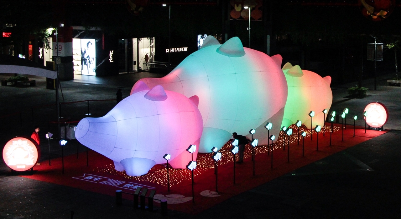 一年一度萬眾期待的「新光三越豬年燈展」將帶來歷年最大、史上最亮的主燈,以繽紛絢麗聲光效果與互動光影科技帶給您新奇炫目的感官饗宴!今年再度邀請跨界王-黃子佼第四度擔任總策展人,福豬主燈外型由鄒族藝術家不舞‧阿古亞那所設計,鄒語中的山豬(Fuzu)諧音似中文“福祿”具有祝福之涵義,讓幸運的山豬為新年帶來福氣吉祥的祝福。