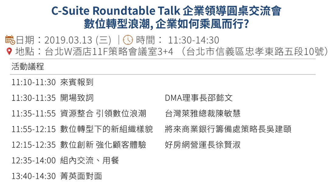 隨著數位經濟的成熟,與創新科技的推陳出新,我們深刻感受到環境變化帶來的挑戰與機會。數位行銷工作不僅僅是溝通宣傳的升級,更是企業數位轉型的開端。我們希望藉由舉辦跨產業、跨領域的圓桌交流會,邀請會員公司及企業客戶高階代表,一起學習、互利、形塑更好的市場機制運作,面對數位轉型推動的挑戰與機會。