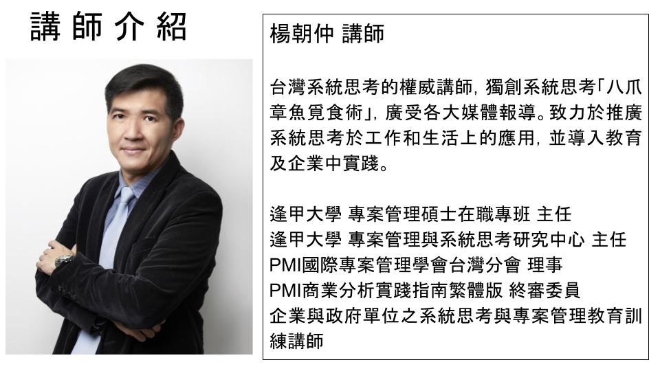 本課程邀請到台灣系統思考權威楊朝仲講師,帶領學員們實際操作融入系統思考的專案打造流程,讓大家可利用這套「系統思考X專案管理」思維工具,在往後的工作、學習和生活上,應用系統思考方法幫助你洞察本質、預見風險、解決問題!