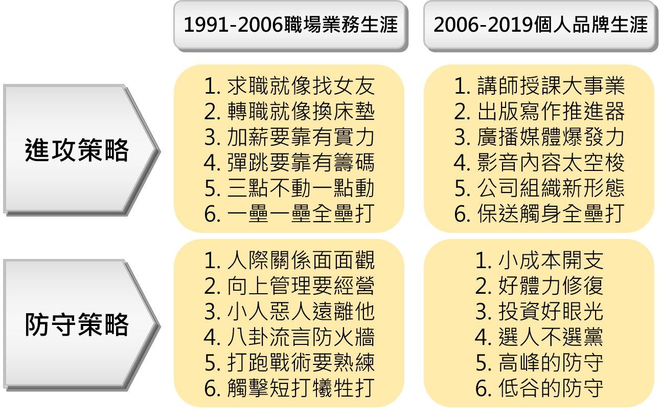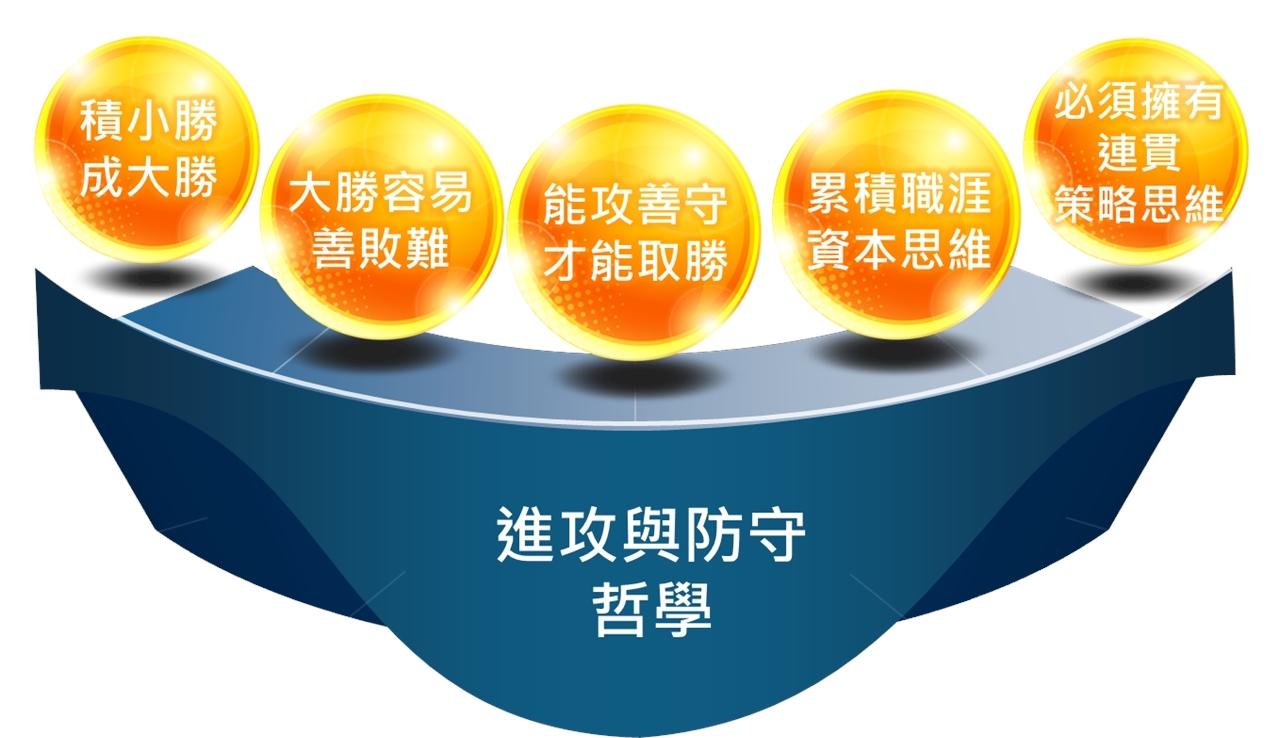 憲哥自有一套哲學,稱它為:「進攻與防守的哲學」。這裡頭包含五個邏輯: