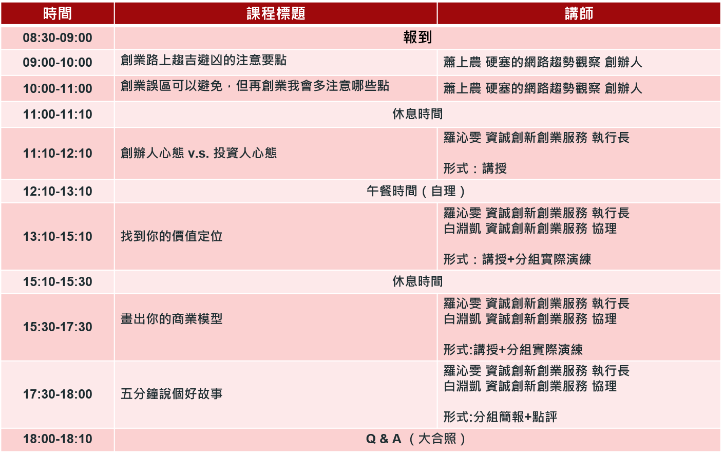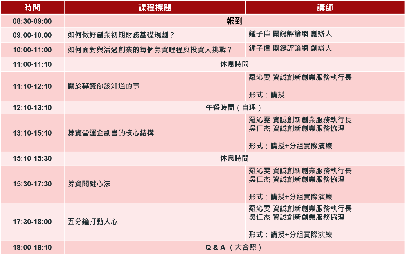 在春季班,我們邀請到INSIDE網路趨勢觀察創辦人蕭上農執行長、關鍵評論網創辦人鍾子偉執行長、資誠PwC Taiwan專業商業顧問群帶領學員學習,你將學習到許多創業「眉角」,例如「怎麼判斷這個創業idea有市場?」、「怎麼說出動人故事吸引投資人?」、「怎麼做好初期財務規劃?」等等,還能在課程中結識其他產業的創業夥伴!