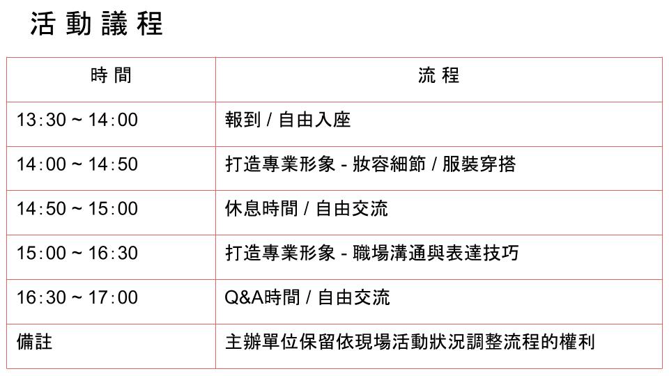 不論是即將步入職場的新鮮人,或在職場打滾多年的老鳥,甚至是組織的主管或領導人,妳是否確定以完美的專業形象投入職場了嗎?