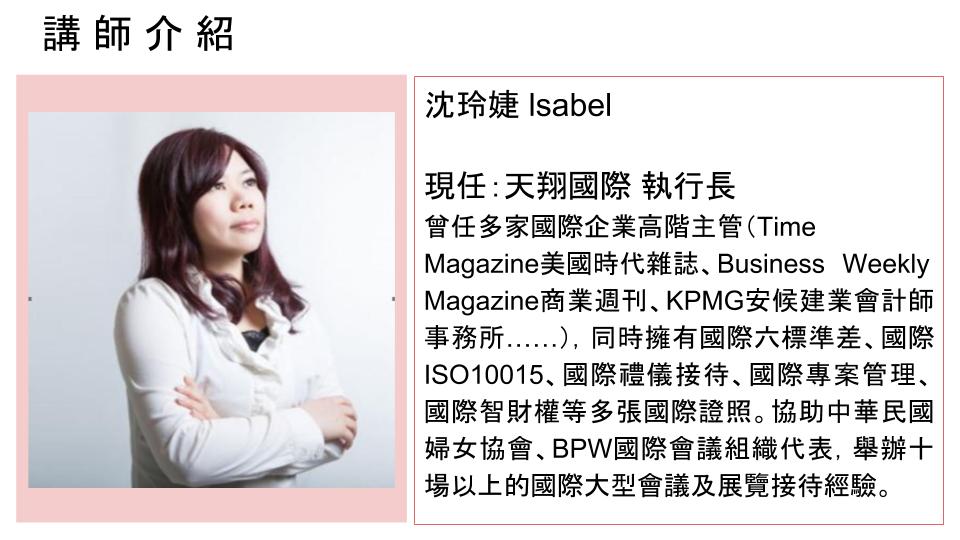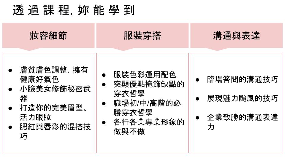 本堂課,邀請到曾任多家國際企業高階主管的Isabel講師,以職場必備的妝容細節、服裝穿搭、溝通與表達,三大面向的技能傳授,打造妳的完美、專業形象,讓妳充滿自信、台風穩健,職場就是妳的伸展台!