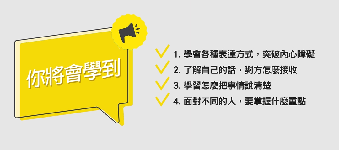 「說清楚好自在」這堂表達課程藉由真實案例分析,學習重新認識自己的說話實況,找到阻撓你順利表達的關鍵,