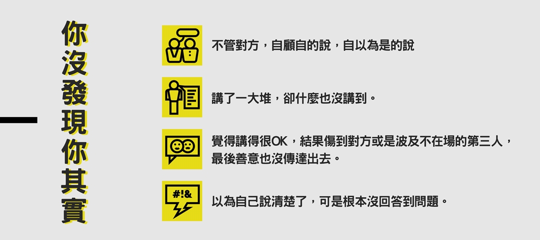 許多人吃過表達上的虧,或是結果總不如預期,所以視表達為麻煩、困難的事,「乾脆都不要說好了!」,不好的經驗累積久了,會開始懷疑自己的口說能力,只要一遇到談正事就沒自信,覺得緊張擔憂。如果不想繼續繞在表達不良的迴圈裡,光是核對意思、反覆解釋、彌補錯誤就花掉彼此的耐性,你需要揪出自己表達狀態中的常態盲點。