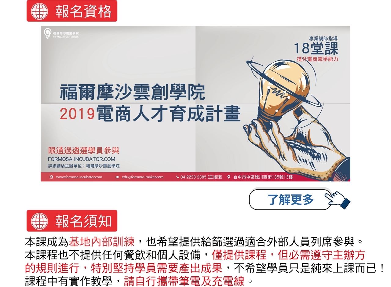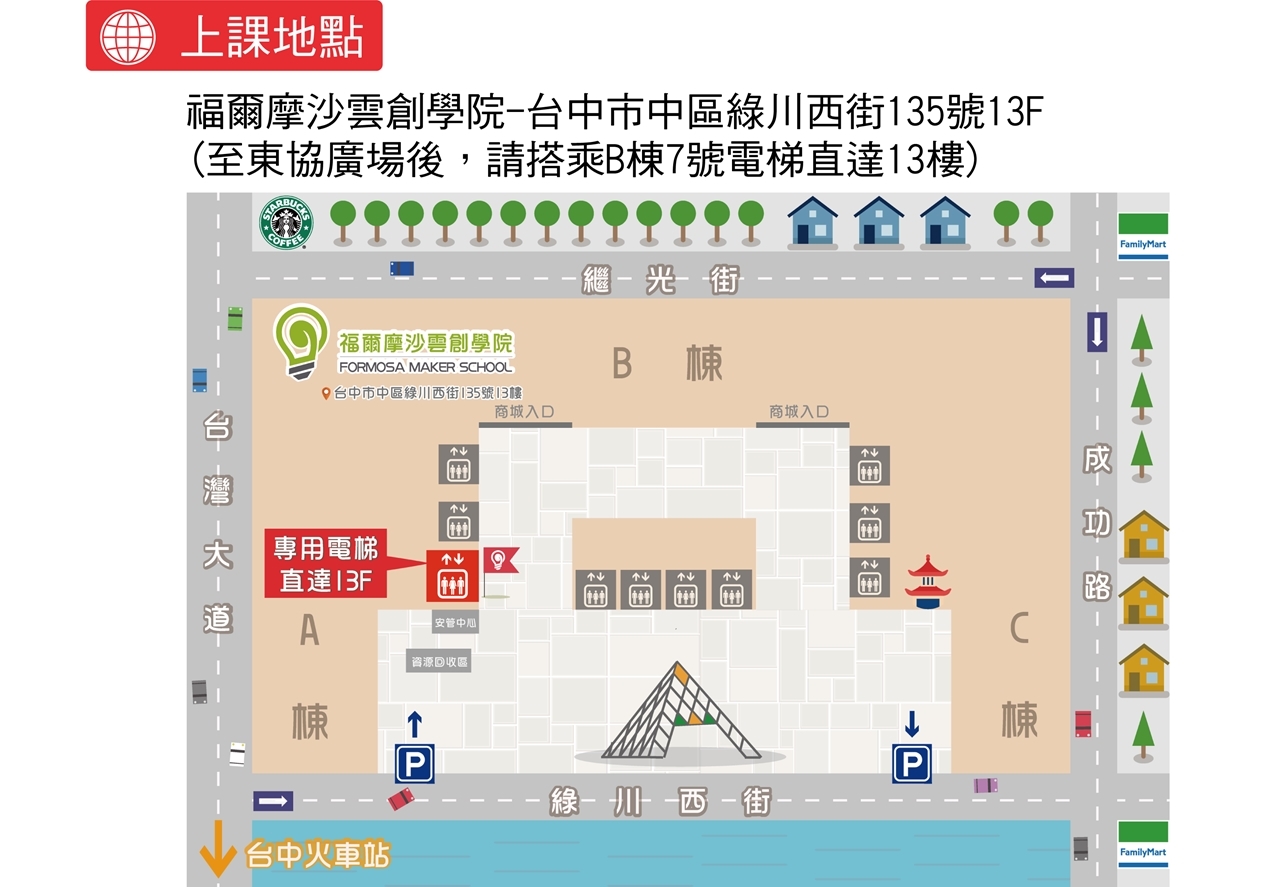 福爾摩沙雲創學院-至東協廣場後,請搭乘B棟7號電梯直達13樓
