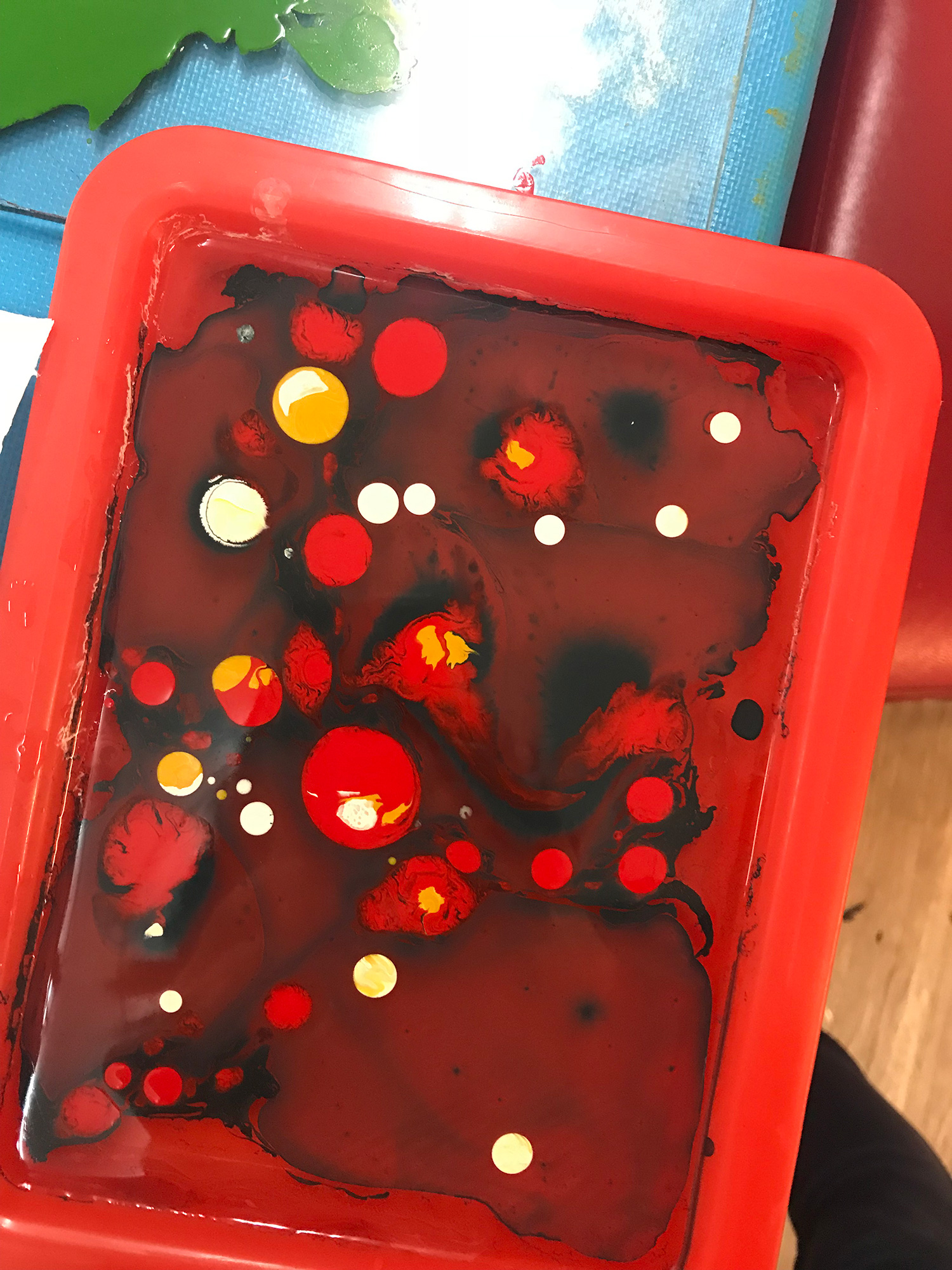 墨流,於水中作畫的一種藝術,依自己的心情喜好將各色的腰果漆料一滴一滴入水中,再與時間的相處下,或大或小的腰果漆色圈因水波跟著律動~形成無窮變化的紋理