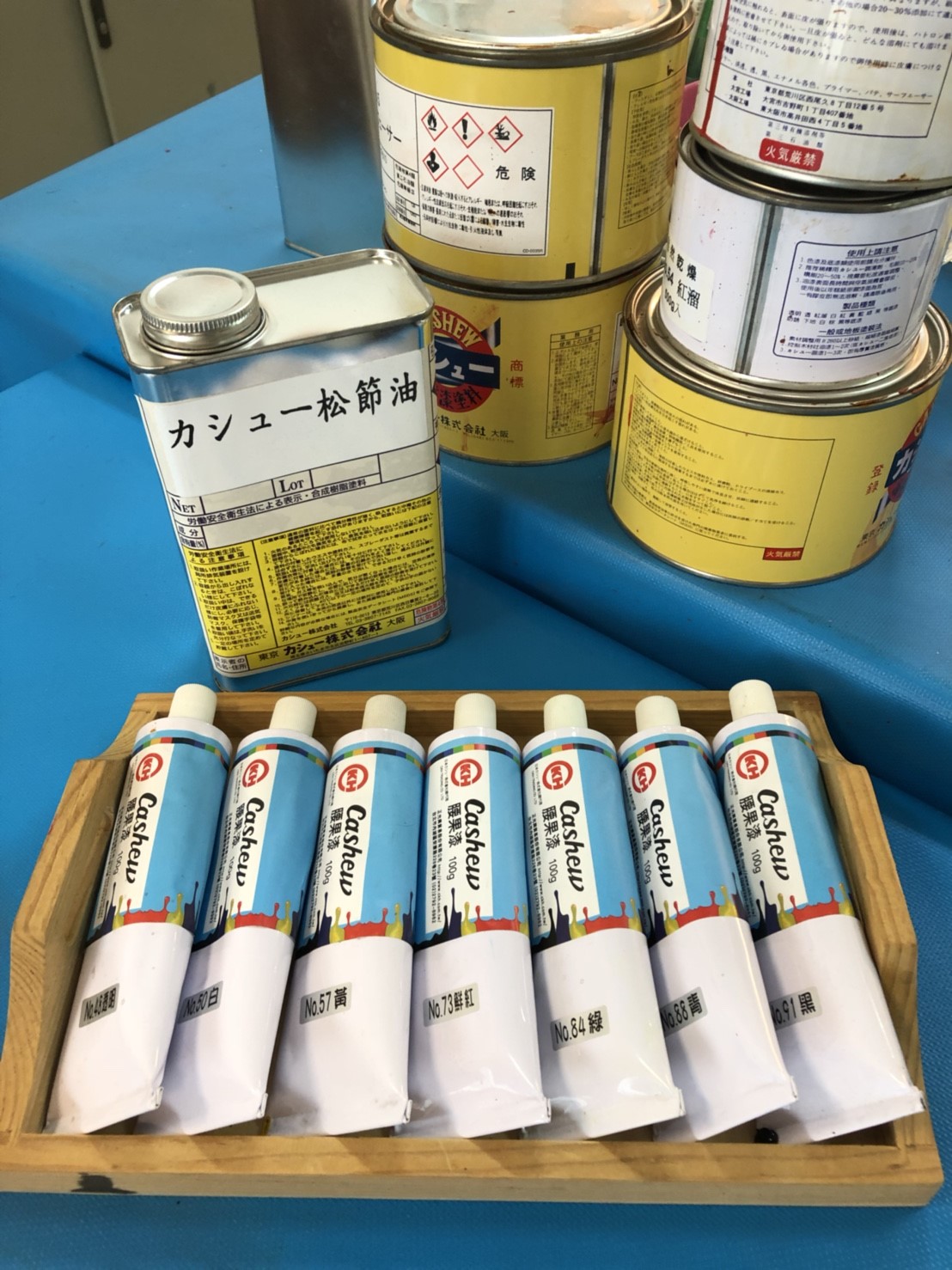 ▪ 材料: 各色腰果漆、溶劑(酒精、松節油、樟腦油)、5cm圓形別針、10cm漆盤、金箔、赤貝箔、青貝箔、米酒、皮革、棉線、金箔保護劑、廚房紙巾