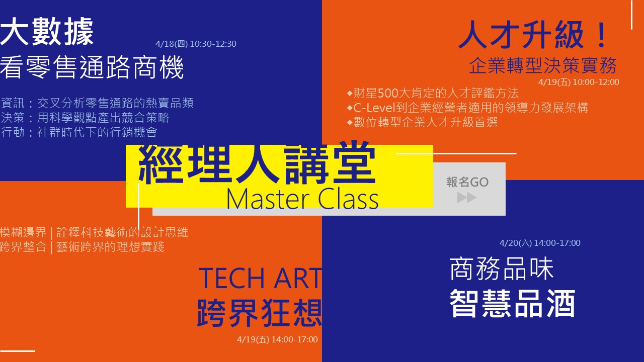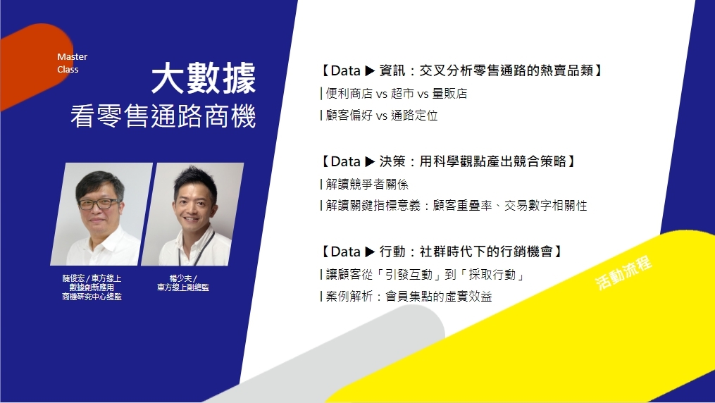 📌大數據看零售通路商機 (報名已額滿;歡迎現場候位,將視情況開放現場報名) 大數據改變零售規則,如何解讀通路、產品、競爭者的競合關係?以數據為依歸的行銷決策,是新零售戰爭的關鍵武器。 🔹 4/18(四) 10:30-12:30 ,經理人講堂 Master Class 🔹 講師介紹: 陳俊宏 / 東方線上數據創新應用商機研究中心總監 楊少夫 / 東方線上副總監 |