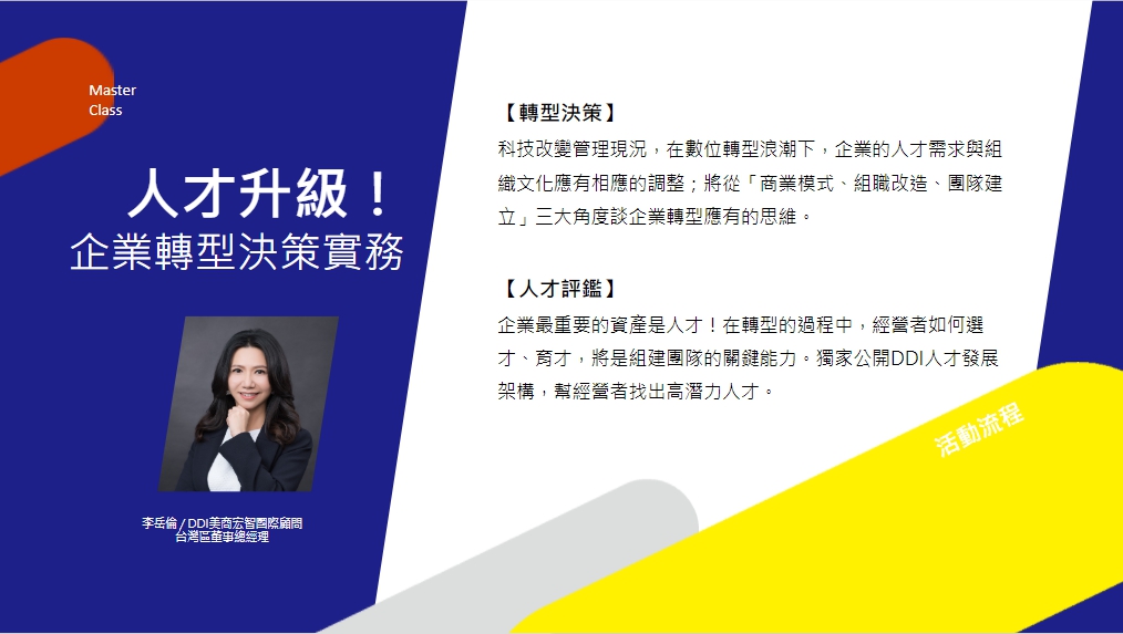 📌人才升級!企業轉型決策 企業最重要的資產是人才!而79%的高階主管卻在甫上任時迷失方向... ※課程報名採審核制。提醒您,完整填寫報名資料可加速審核通過。 |