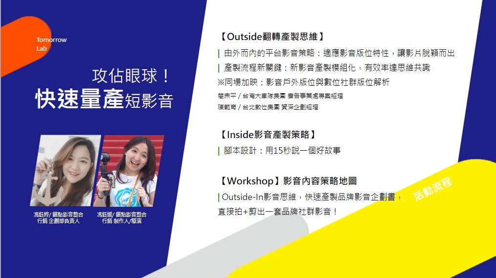 🔎攻佔眼球!快速量產短影音工作坊 5G時代,影音需求量暴增,如何讓影片脫穎而出、擴大傳播成效?✅ 4/19(五) 09:30-12:30 ,明日實驗室 Tomorrow Lab ✅ 講師介紹: 馮鈺婷 / 錨點影音整合行銷 企劃部負責人 馮鈺媛 / 錨點影音整合行銷 製作人/導演 |