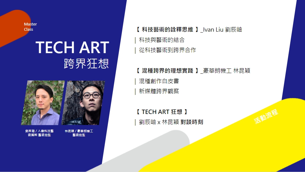 📌TECH ART 跨界狂想 模糊邊界 X 跨界整合遊走在科學和藝術之間,深信科學是種文化,除了實用也可以被欣賞。 2017年 數位時代譽為「無法定義的跨領域藝術新星」 2016年 360度環景式互動藝術作品《薔薇之塔》 阿姆斯特丹燈光藝術節決選入圍、法國文化部徵選之全球15位數位藝術專業人士之一 他是,劉辰岫。 2017 年 世大運那座由陳金鋒引燃的聖火台 台中花博園區高達 15 公尺的機械花《聆聽花開的聲音》 台電大樓70周年改造計畫《日光域》 與台灣高鐵合作之《處處——台灣高鐵ARt》 打破藝術的邊界,橫跨科技、機械、景觀等多種領域,成為創造這些未來城市新樣貌的幕後推手。 他們是,豪華朗機工。 💈 TECH ART 跨界狂想,一起探索科技藝術,玩轉未來。✨ 🔹4/19(五) 14:00-16:30 ,經理人講堂 Master Class 🔹講師介紹 劉辰岫 Ivan Liu / 人嶼科技藝術國際 藝術總監 林昆穎 Kun-Ying Lin / 豪華朗機工 藝術總監 |