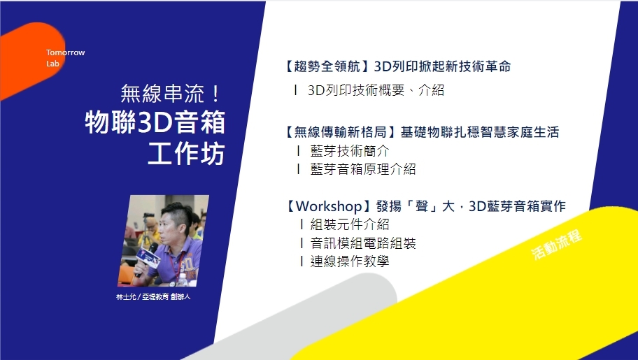 🔎無線串流!物聯3D音箱工作坊 發揚「聲」大-物聯智慧生活, 3D音箱實作✅ 4/20(六) 09:30-12:30,明日實驗室 Tomorrow Lab ✅ 講師介紹: 林士允 / 亞堤教育 創辦人 |
