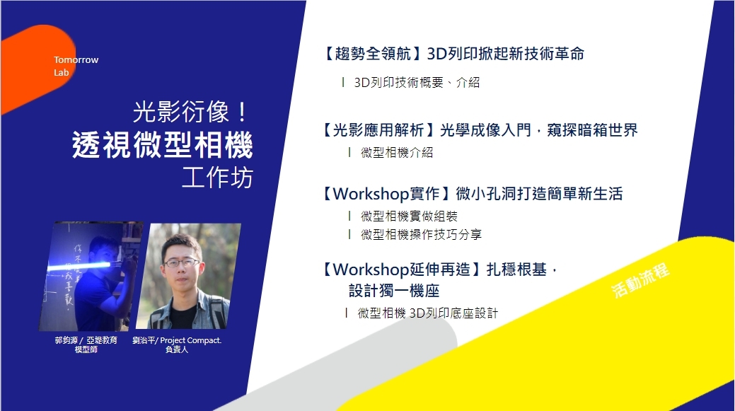 🔎光影衍像!透視微型相機工作坊 光學成像入門,微型相機自己打造!✅ 4/20(六) 13:30-17:00 ,明日實驗室 Tomorrow Lab ✅ 講師介紹: 劉治平 / Project Compact. 負責人 |