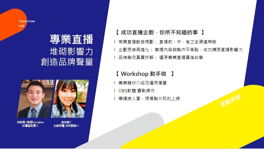 🔎專業直播工作坊|堆砌影響力 創造品牌聲量 (報名已額滿;歡迎現場候位,將視情況開放現場報名) 解鎖一線國際品牌直播策略規劃、案例分析、及實務操作✅ 4/19(五) 14:00-17:00 ,明日實驗室 Tomorrow Lab ✅ 講師介紹: 邱詮智 / 美商Socialive 台灣區負責人 施筱姍 / 生鮮時書 共同創辦人 |