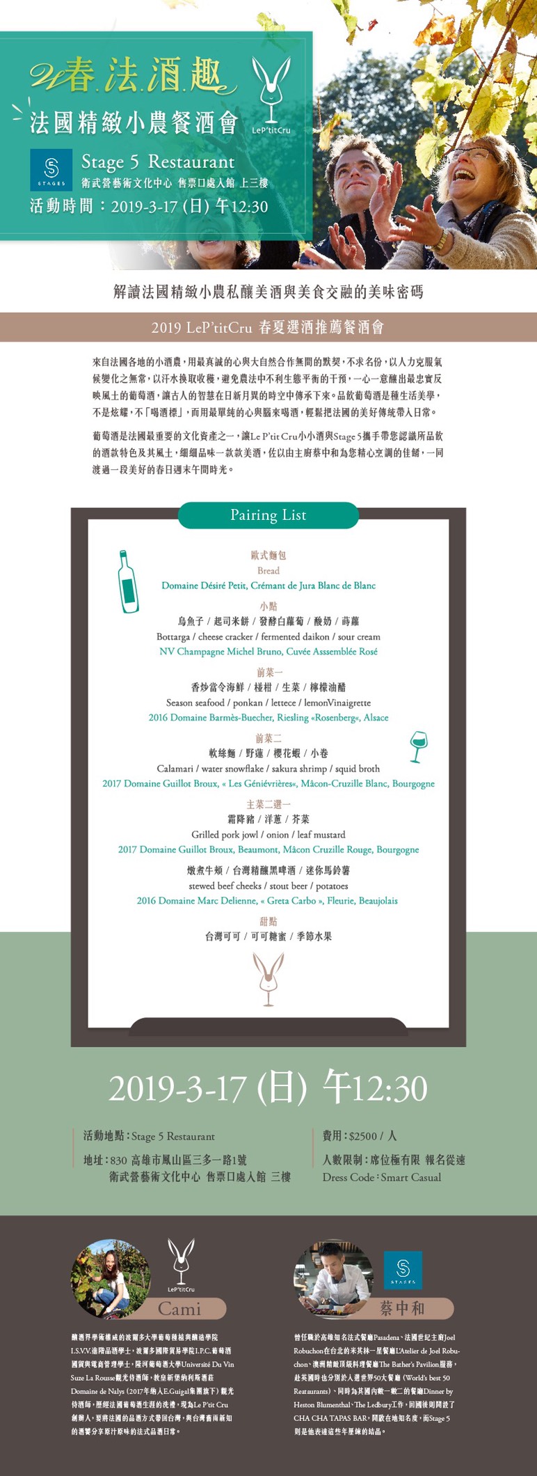 讓Le P’tit Cru小小酒與Stage 5餐廳攜手帶您認識所品飲的酒款特色及其風土,細細品味一款款美酒,佐以由主廚蔡中和為您精心烹調的佳餚,一同渡過一段美好的春日週末午間時光。