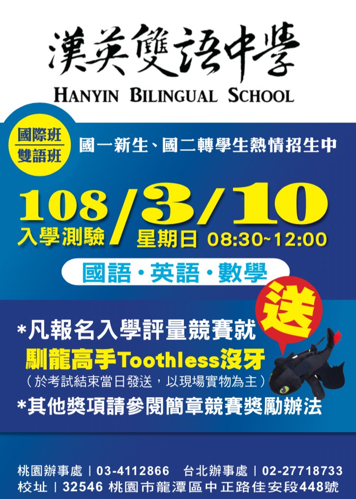 凡報名入學評量競賽,考試結束即送可愛布偶「馴龍高中 Toothless沒牙」一只! - 09:30-11:30:國一班招生說明會,說明會內容