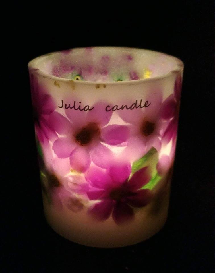 除了乾燥花燭杯,我們還要來認識仿真花,仿真花與石蠟結合製作較透亮的燭杯,有另外一種感覺喔。一樣可內置小茶蠟使用。