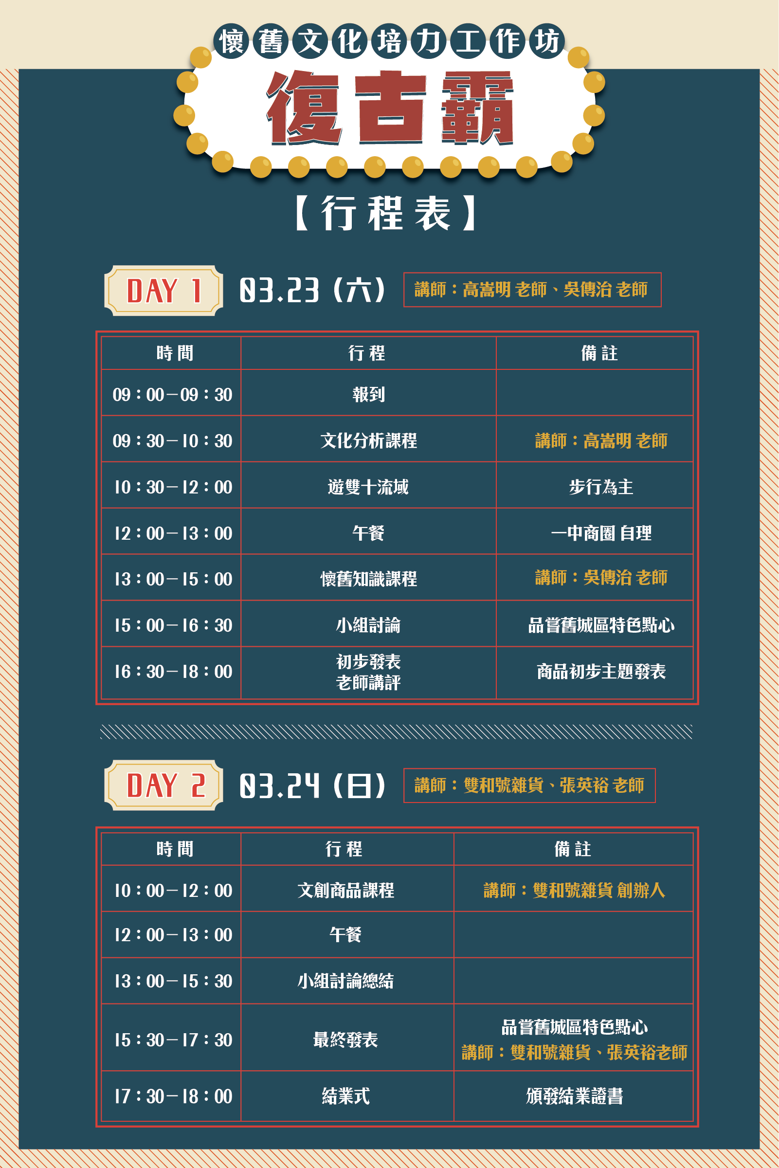 邀請高中職以上,凡對懷舊相關事物、雙十流域文化有興趣或喜愛之創意家,想透過腦力激盪為在地設計獨特文創商品的你,我們誠摯歡迎你。
