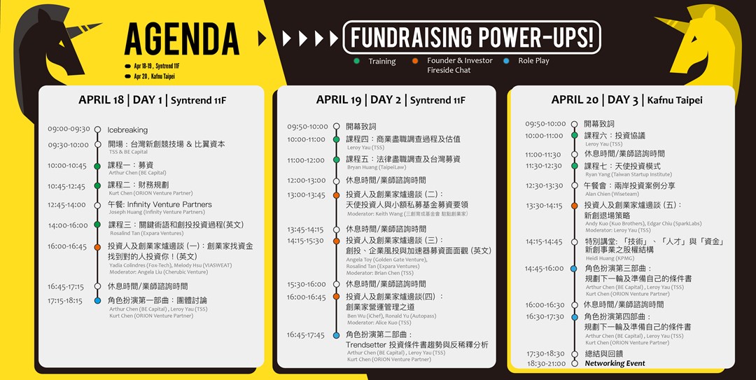 - 一對一會談:投資人、法務專家、財務專家(場次和名額有限,先搶先贏,還不趕快報名!)