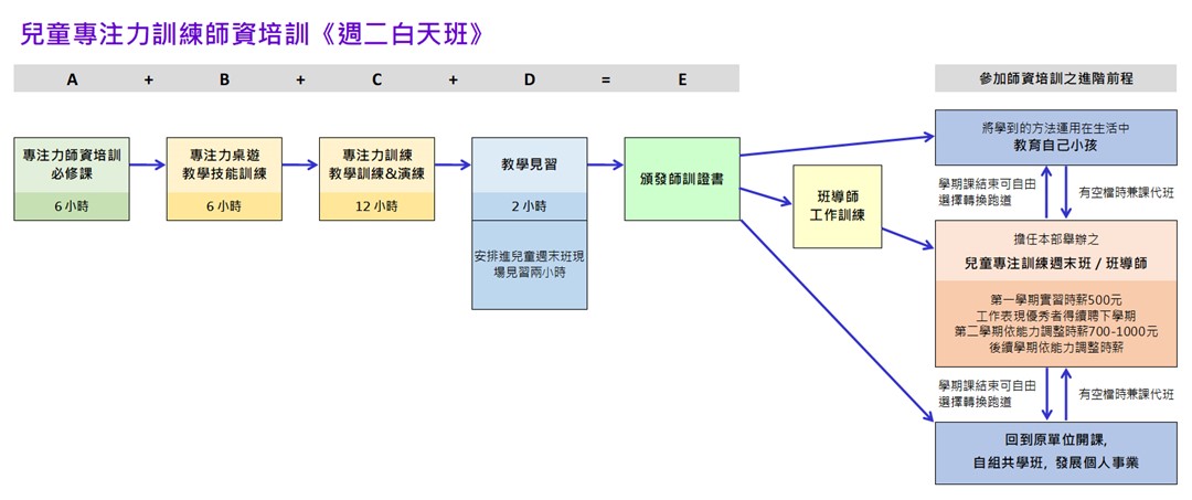 1. 受訓學員參加『兒童專注力訓練師資班』訓練課程+見習+演練,全程完成訓練後,由社團法人專注力訓練推廣協會頒發兩張結業證書「兒童專注力桌遊師資」「兒童專注力訓練師資」。
