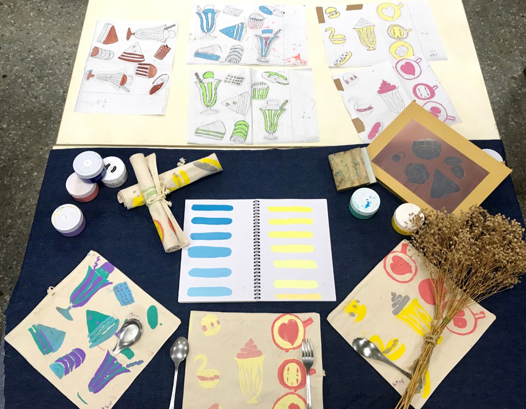 「食」:探討各國、各文化飲食特色,設定創作主題,學習構圖、排版、色彩計畫設計印花,並以絹印的方式設計餐袋墊,可以攜帶環保餐具,攤開後可以墊便當,讓學生在用餐時欣賞自己設計的餐桌風景,同時可以培養環保的觀念。