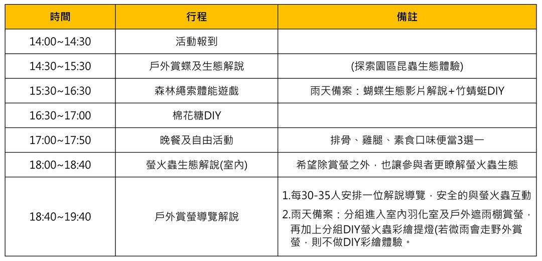 ※ 注意:「森林繩索體能遊戲」、「戶外賞螢導覽解說」皆有準備雨天備案!