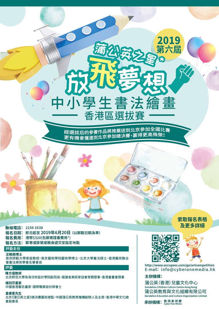 蒲公英教育與文化組織為香港的註冊慈善機構,致力推動兒童在藝術文化上的才能發展,今次連同蒲公英(香港)兒童文化中心把北京盛賽《蒲公英之星共繪彩虹–第六屆中小學生書法繪畫優秀作品推選活動》帶到香港,在香港進行選拔賽,挑選優秀作品代表香港區出賽,與全國各大省區中小學生進行一場盛大的文化交流!而CYBER ONE MEDIA數碼峰媒體為今次的承辦機構,協助報名及行政處理事宜。