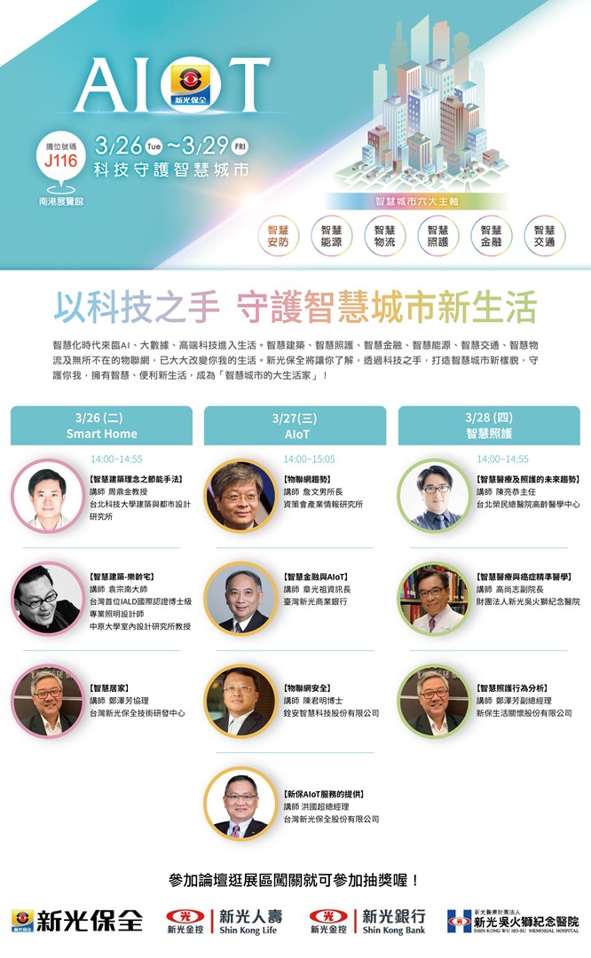 2019年一開春,新光保全便宣示以AIoT服務的提供者為目標,與關係企業人壽、銀行、醫院共同參加智慧城市展。位於南港展覽館J116展區的新光保全,整體展出六大主題:智慧安防、智慧照護、智慧住宅、智慧交通、智慧物流、智慧金融;囊括城市核心到外圍,從居家生活、醫療照護到公共空間的能源管理、金融服務等,以及住宅、交通、物流等應用,展現整合物聯網技術及加入AI智能的商品和服務,整體以「科技智慧守護城市」為展示主軸。