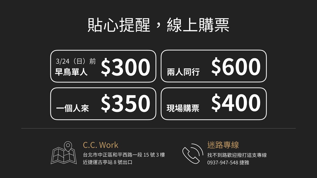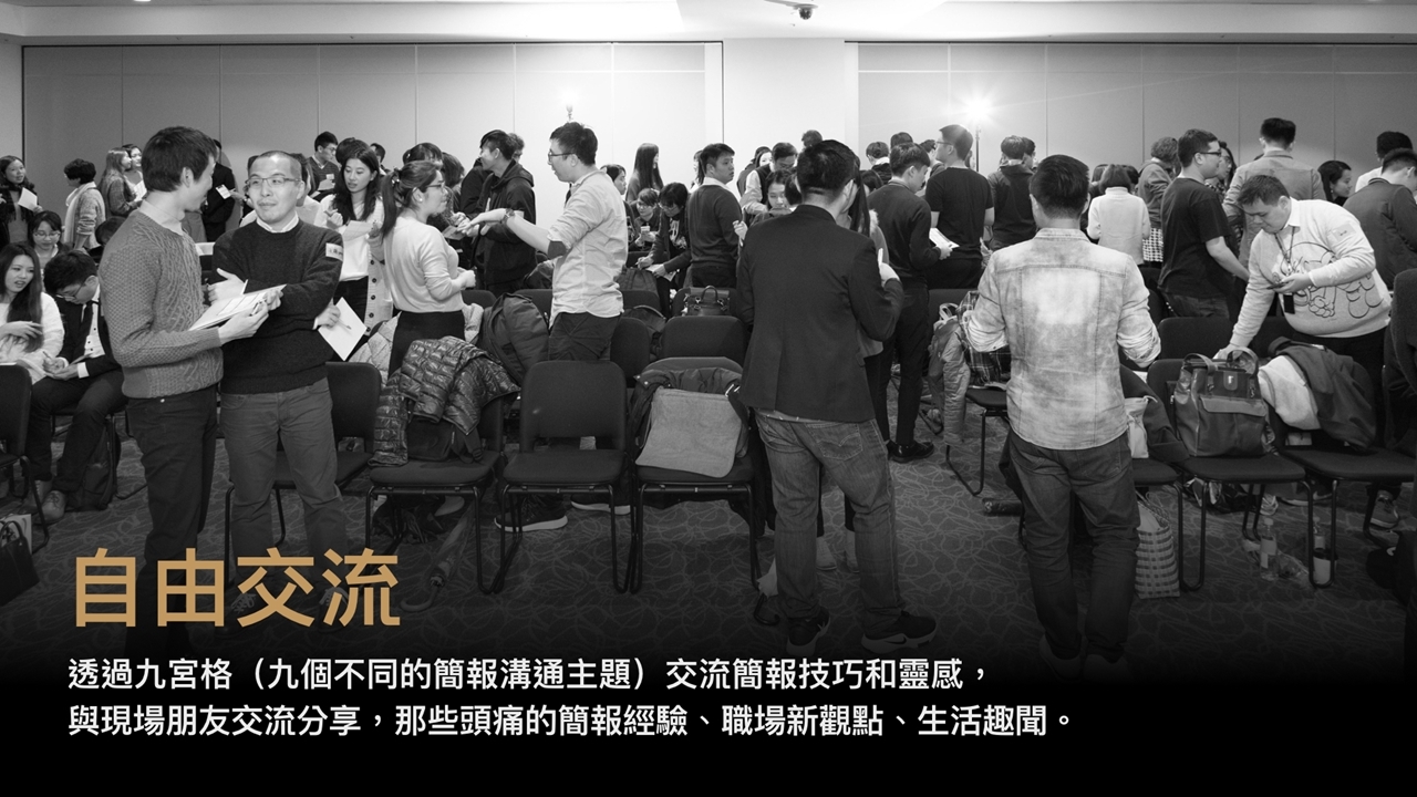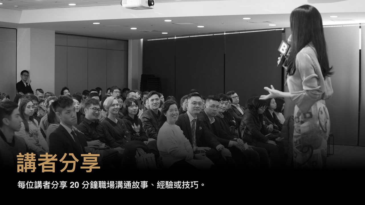 歡迎各領域朋友一起來聽三位講者分享簡報溝通經驗及技巧,並與現場的職場人士交流,渡過不同體驗的夜晚。