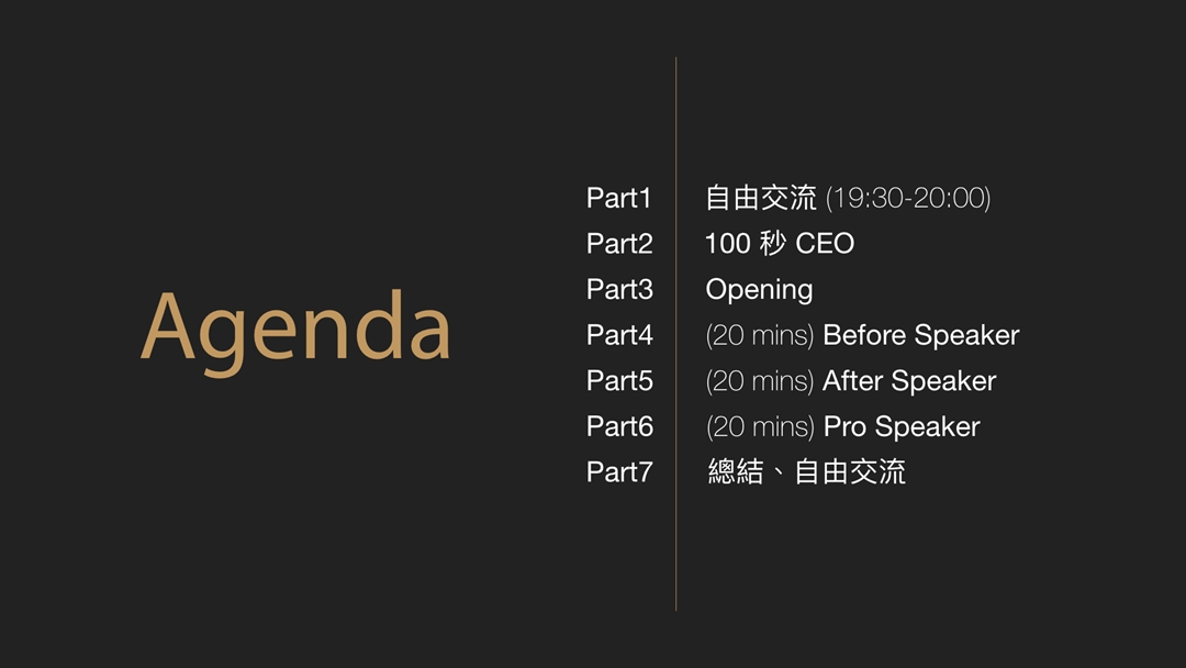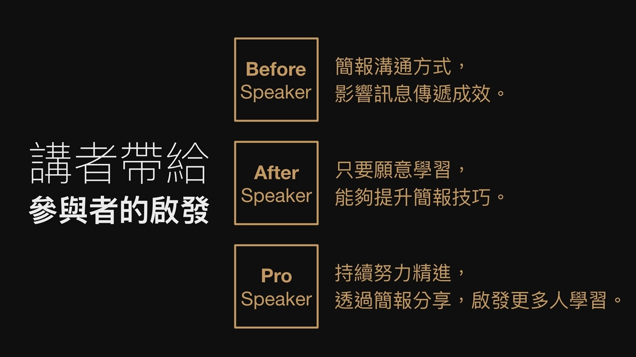 「主題分享」將由三位講者( Before, After, Pro Speaker )依次帶來 20 分鐘的簡報溝通故事、經驗或技巧分享。