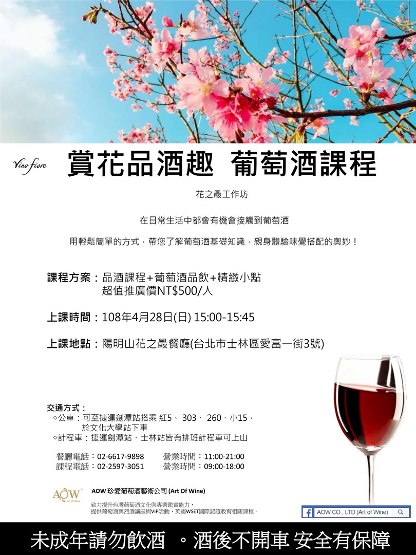 活動介紹:葡萄酒常出現在社交場合或餐桌上,但往往我們只懂得飲卻沒有更進一步的了解。這次透過輕鬆有趣的方式帶你認識葡萄酒知識,不但可以了解葡萄酒的釀造、類型以外,還能學習品酒的技巧並搭配兩種飲品來實地品嘗。讓我們一邊欣賞美麗的景色,一邊沉醉在微醺的浪漫氛圍中吧!