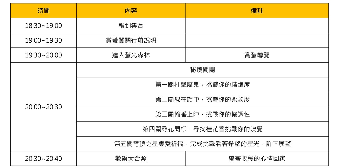 ※螢火蟲的出現條件較多,並不一定保證出現,請參加者悉知
