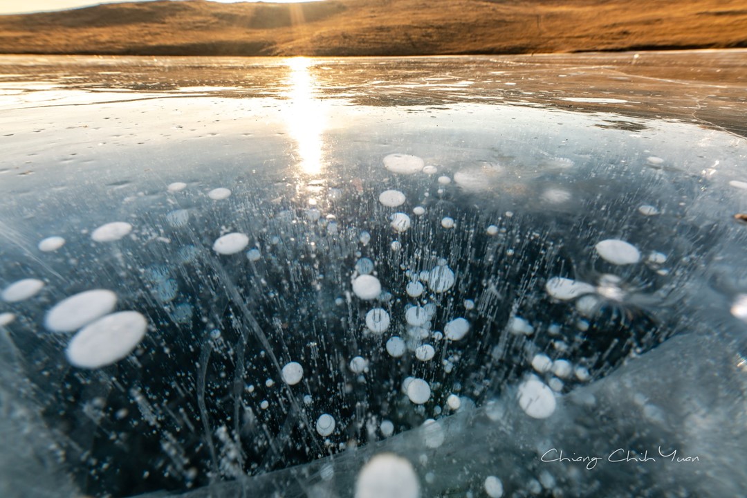 走在冬天冰封的湖面上,如果您夠幸運的話,低頭便可以見到貝加爾湖冬季限定的泡泡冰,這是湖底冒出的甲烷氣體在零下三十度的低溫瞬間冷凍後的產物。