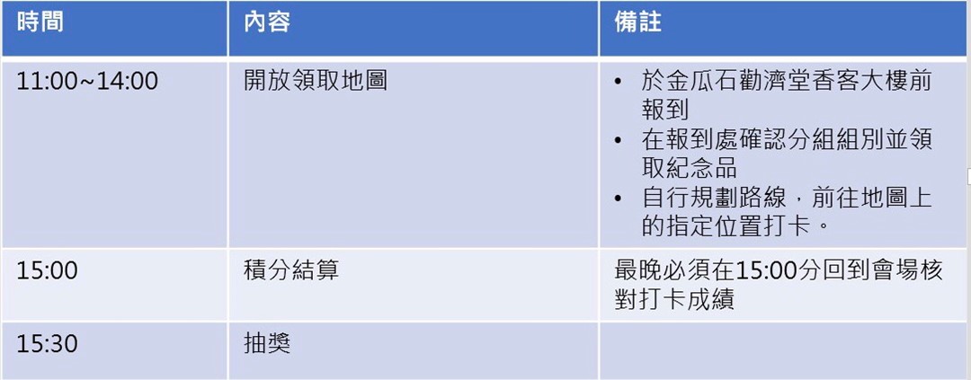 •活動參與者最晚必須在15:00分回到會場核對打卡成績。集滿十點及二十五點者能參加抽獎。