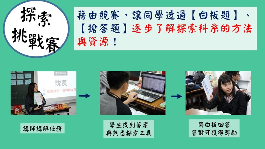 【探索挑戰賽】想要了解探索科系有哪些資源可以使用嗎? 透過探索挑戰賽的【白板題】、【搶答題】讓你可以在遊戲的過程中, 了解科系探索的【資源】與【方法】。