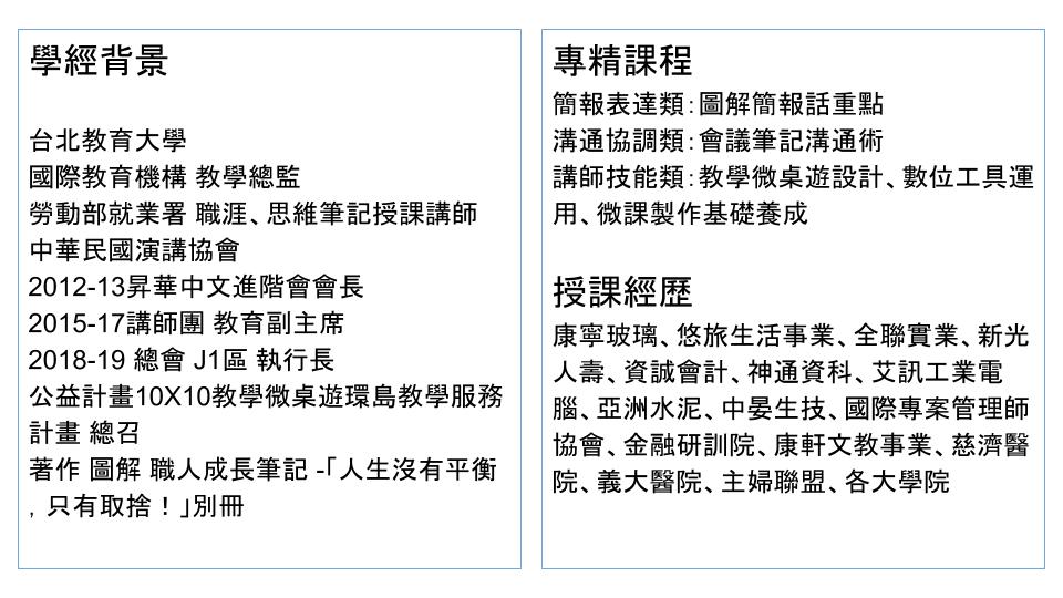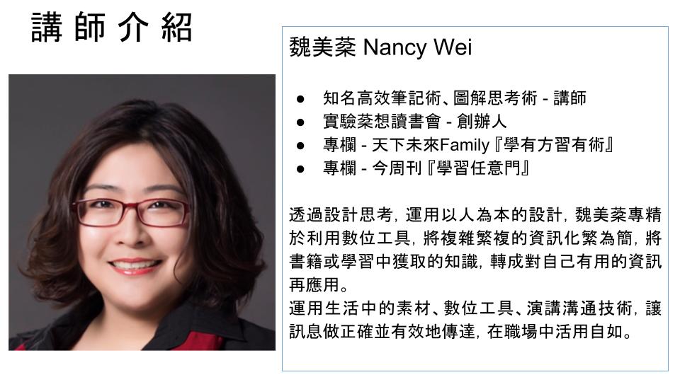 本堂課,邀請到擁有授課經驗近二十年、高效筆記術與圖解思考術的知名講師-魏美棻Nancy,專為職場人士設計出符合職場需求與應用場景的高效圖解術: