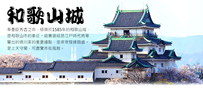 【和歌山城】天守閣的白牆矗立於綠意盎然的虎伏山上,展現御三家的威嚴。和歌山城是天正13年1585定紀州後令其弟秀長所建,負責建造的是築城名人藤堂高虎,他建了本丸及一之丸殿。該城首先由秀長的「城代」守城者桑山重晴統理,到了慶長5年1600,在關之原戰役立下戰功的淺野幸長入城。元和5年1619,成為紀州55萬5千石之城,與水戶、尾張並列為德川御三家之一,見證悠久的歷史。