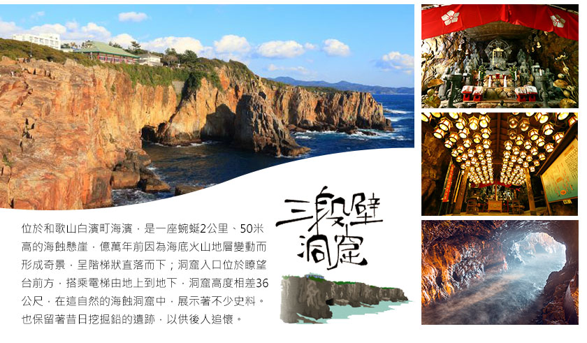 【三段壁】位於和歌山白濱町海濱,是一座朝向太平洋的一段蜿蜒2公里、50米高的海蝕懸崖,在億萬年前因為海底火山地層變動而形成的奇景,呈階梯狀直落而下宏偉壯觀;來到這裡還別有洞天讓人不得不佩服前人的聰明因為單從外觀看似平凡卻暗藏玄機,搭乘電梯深入36米下的洞窟細一看竟別有洞天,傳說這裡曾是日本古代熊野水軍的訓練基地在日本源平之戰時熊野水軍善用地理資源而得到勝利步行在古道中還隱約受到那當時戰爭的緊張氣氛為了紀念熊野水軍在此也放置了水軍將領的「仿頭盔及軍服」供遊客拍照留念,而在洞窟的底頭在此供奉供奉著守護人們平安幸福的水神「辯財天」以及十六名童子神像再順著步道前進可以觀賞到岩壁因長期受到海浪拍打侵蝕而形成各種奇形怪狀的岩石景觀或您可以走近到崖邊近細細聆聽海濤怒吼。