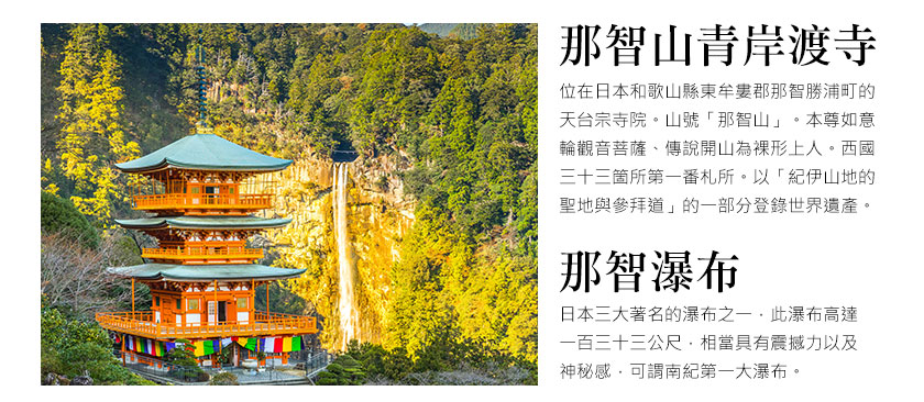 | 第 3 天 | 勝浦-日本三大名瀑之一~那智瀑布-日本國家重要文化財產~那智青岸渡寺-來自中國傳奇性的人物~徐福公園-天然紀念物~鬼城‧獅子岩-日本第一神宮~伊勢神宮~贈送赤福餅~託福橫町古街散策~伊勢志摩溫泉 |