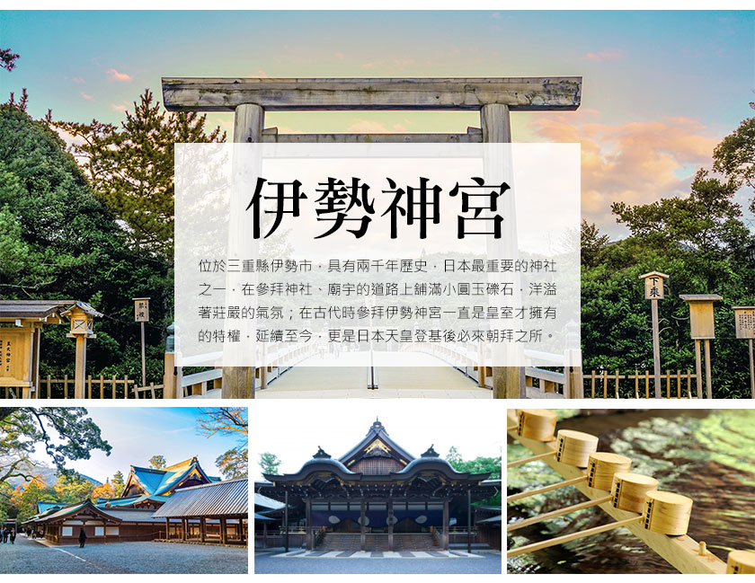 【伊勢神宮】具有2000年歷史在日本是最重要的神社之一,在『日本書紀』中記載神器之一的八咫神鏡一直被歷代天皇當作天照大御神而被珍藏在皇局內,直到第十代祟神攻皇覺得神鏡放在皇局中略有不敬,於是第十一代垂仁天皇就命付皇女倭姬命,雲途四方尋找一處供奉八咫神鏡的淨靈寶地,終於在五十鈴川邊、古木參天之處,尋覓到天照大御神的永久鎮座之地,就是今日三重縣伊勢市的【伊勢神宮】,在參拜神社、廟宇的道路上舖滿了小圓玉礫石,洋溢著莊嚴的氣氛;在古代時參拜伊勢神宮一直是皇室才擁有的特權延續至今,更是日本天皇登基後必來朝拜之所。而伊勢神宮最神奇之處,就屬每20年一次的搬家活動,稱作『式年遷宮』每逢第20年神宮便會被拆掉,正殿內的供奉神寶也會一起搬家,新家的地點通常都不會太遠大多是在舊宮的隔壁,雖然每20年就遷宮一次的原因到現在都不是很清楚但是這20年一次的遷宮依舊是日本重要的一大盛事。