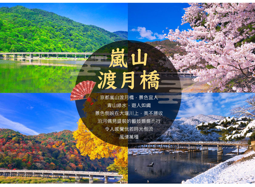 【渡月橋】別名嵐橋,橫跨在京都嵐山的大堰川上,全長155公尺,據說是空海的弟子道昌於日本平安時代初期的836年(日本承和3年)整修大堰川時所建。四百數十年後,龜山上皇在某個沒有雲朵的夜晚,看到月亮在橋的正上方緩緩的由一邊移動到另外一邊,猶如渡橋因而得名。染上一層鮮豔紅色的渡月橋融入嵐山景緻,風景秀麗,成為代表京都的明媚景色,吸引許多旅客造訪。